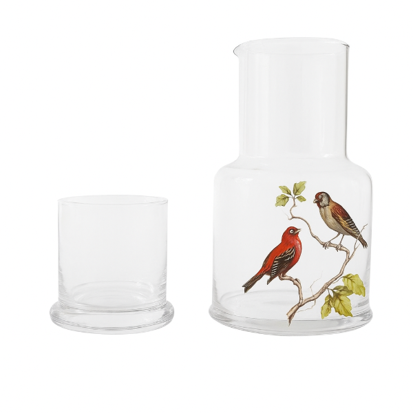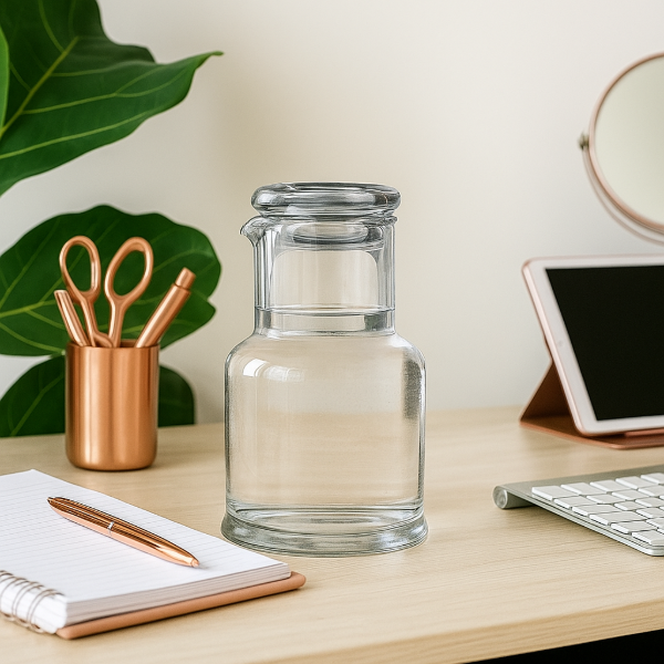 Lindísima jarra con vaso, que también hace de tapón, para llevar al escritorio, la mesa de luz o acompañar tus cenas.
