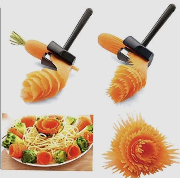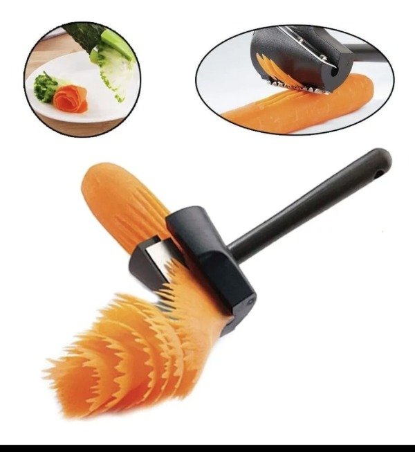 Funciona como un sacapuntas, podes usarlo con verduras firmes como zanahoria, pepino, rabanito.