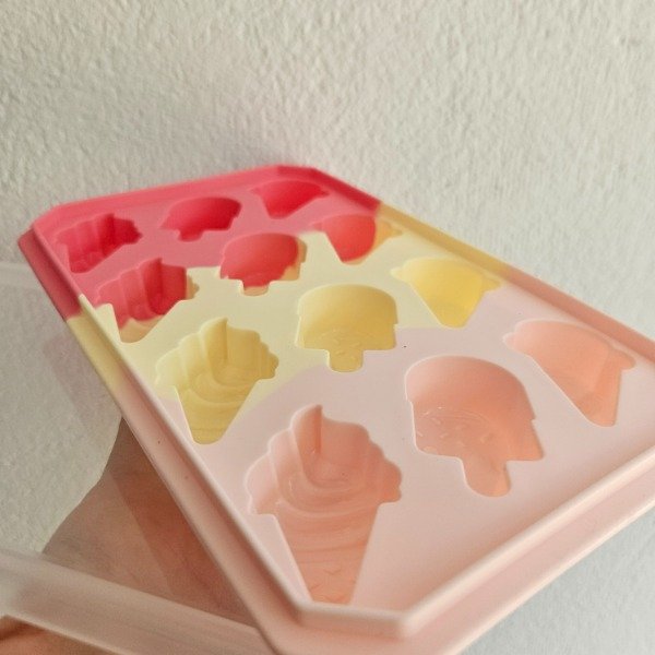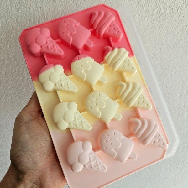 Cubetera de silicona para hacer 12 cubitos con forma de heladitos. Su material flexible permite que sea mucho más fácil desmoldar. Tapa rígida que permite que se apilen