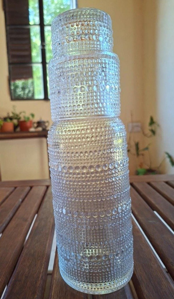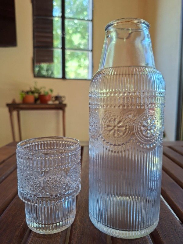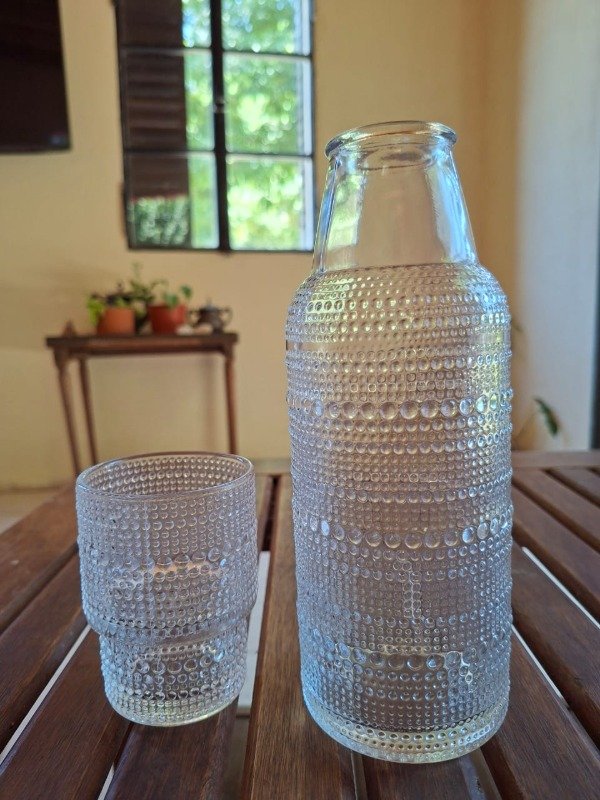 Lindísima jarra con vaso, que también hace de tapón, para llevar al escritorio, la mesa de luz o acompañar tus cenas.