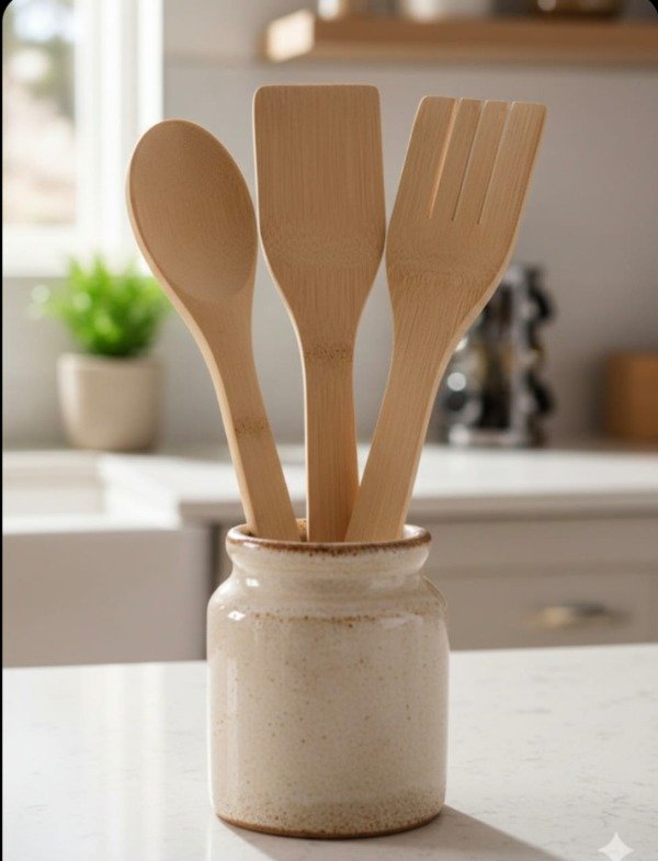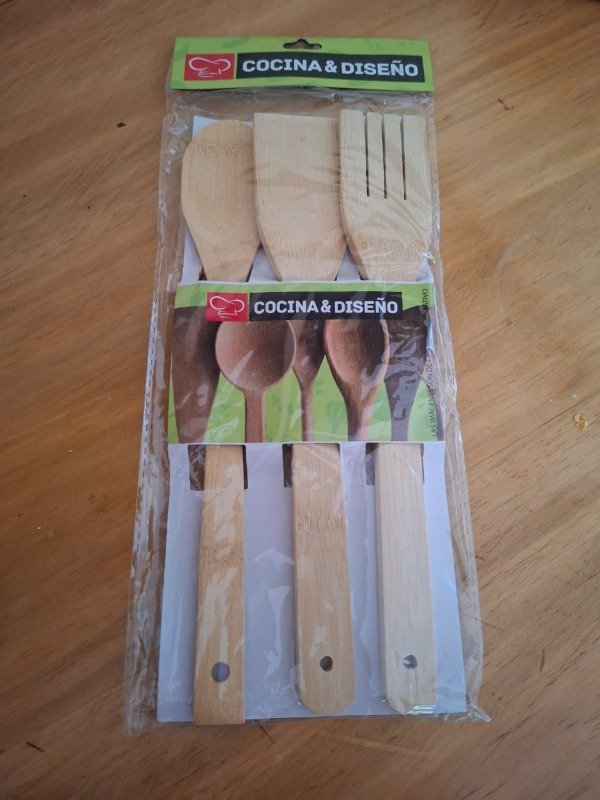 Este juego de utensillos de cocina, hechos de bambu, son ideales para usar en cualquier superficie antiaherente ya que no rayan.