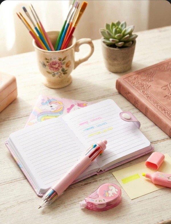 Mira este BELLO kit con libreta, lapicera de varios colores, resaltador y cinta de pegar con dibujos, y haces feliz al niño!😉
