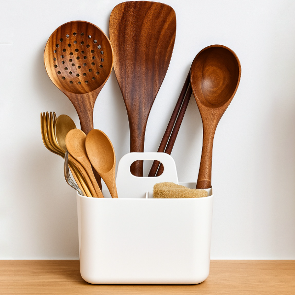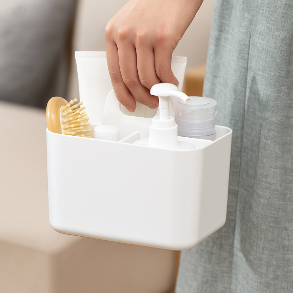 Es de plástico con divisiones que permiten mantener ordenado su contenido.